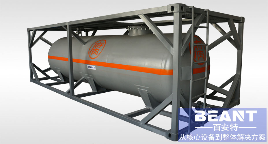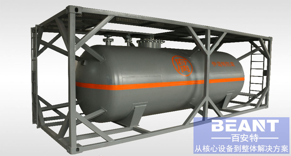 用于裝運酒類、油類、液體食品、化學(xué)藥品等液體貨物的集裝箱。主要由液罐和框架構(gòu)成。液罐為橢圓形或近似球形,采用雙層結(jié)構(gòu)。內(nèi)壁采用不銹鋼;或用其他剛性材料制成,但需涂布一層環(huán)氧樹脂,防止液體貨物的腐蝕。外壁采用保溫材料。一般罐頂有圓形的裝貨口,罐底有卸貨閥。有高壓液罐、低壓液罐、保溫液罐、帶加熱裝置液罐等數(shù)種。框架采用高強(qiáng)度鋼材制成,液罐放在框架中間。罐式集裝箱的搬運操作、裝貨、卸貨、貯藏均需一定專門場所,并配備專門的消防安全設(shè)備。